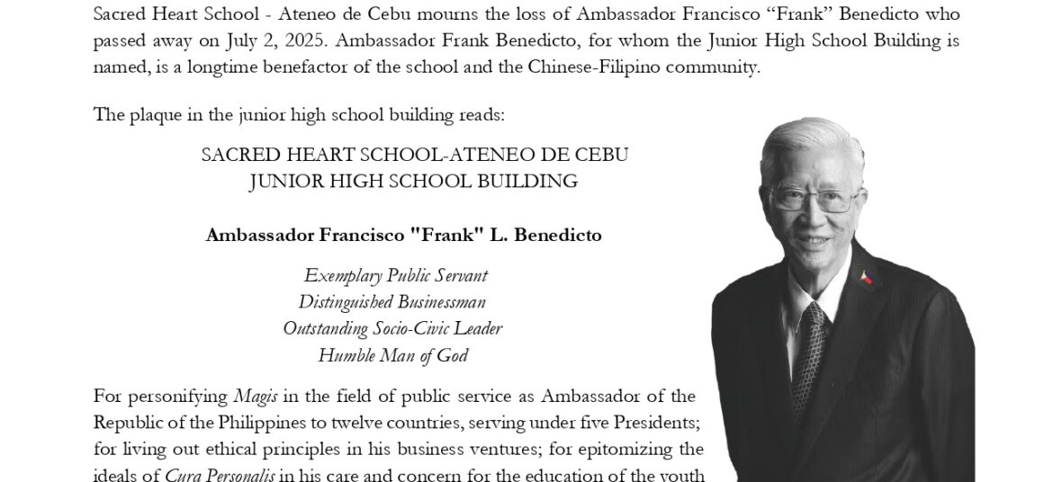 Sacred Heart School – Ateneo de Cebu mourns the loss of Ambassador Francisco “Frank” Benedicto who passed away on July 2, 2025. Ambassador Frank Benedicto, for whom the Junior High School Building is named, is a longtime benefactor of the school and the Chinese-Filipino community.