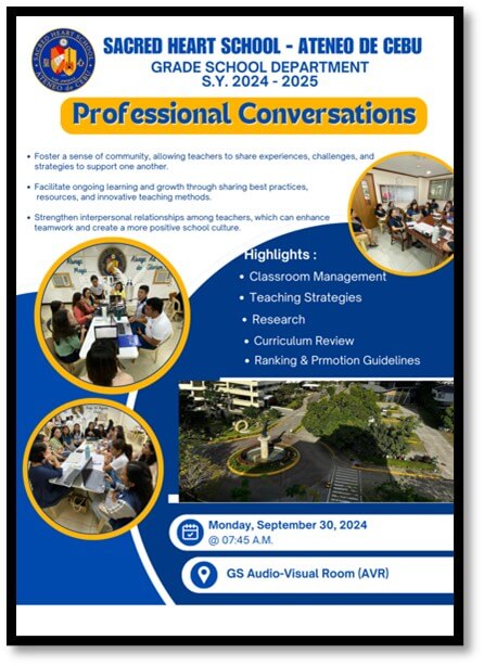 Professional Conversations focused on ongoing employee development. Topics are anchored on the faculty’s and staff’s developmental action plans, classroom observation feedback, and educational updates and trends among many others. They also intend to maximize in-house experts and external community resources to ensure a more grounded and holistic formation for teachers and staff. MVP