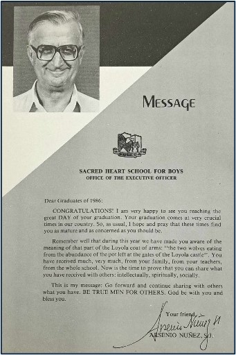 In his message to the graduates, Fr. Arsenio Nuñez, SJ, then Executive Director of SHS-Boys spoke of the year’s graduation as one that “comes at very crucial times” of the country. Complementing this is the reminder of the School’s Director, Fr. Albert Ricard, SJ: being men for others “does not mean only to be kind to others, or to say ‘thank you’ … [but also] to try to improve the situation of others.” These words of wisdom from the Jesuits of 86 articulated where Sacred Heart School stood in the country’s fight for freedom, justice, and peace.
