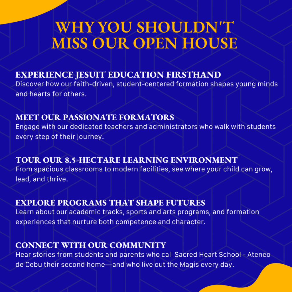 Sacred Heart School – Ateneo de Cebu is excited to invite prospective students and their families to its Open House events for School Year 2025–2026, a signature opportunity to get a closer look at the distinct Jesuit education that forms young men and women for others.